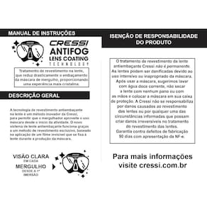 A máscara Cressi A1 Dual Anti Fog, tem como principal característica o tratamento anti fog em sua lente. Tal tratamento, impede a condensação do ar interno em contato com a lente da máscara, isso evita a formação de gotículas de água responsáveis pelo embaçamento.