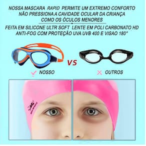 A Máscara De Natação Gold Sports Rapid Infanto - Juvenil 7.0 High Definition Característica 1. Moldura de cloreto de polivinilo com revestimento resistente a impacto. 2. Campo extra largo de visão: Nossa máscara de natação Gold Sports Infanto-Juvenil são projetados com lentes mais largas e possuem campo de visão de 180 graus. Proporciona máximo campo de visão e clareza para garantir seu filho tem uma experiência de natação mais confortável. 3. Design funcional: O novo botão de ajuste das tiras facilita o ajuste. O frame se encaixa perfeitamente, e o design mais largo distribui a pressão de forma mais uniforme, dando sua criança uma experiência de uso confortável. 4. Proteção antiembaçante e UVA e UVB 400: Nossa máscara de natação infanto-juvenil são equipados com lentes de policarbonato resistente a impacto. Todas as lentes proporcionam proteção antiembaçante e anti-UVA e UVB 400, que podem proteger os olhos do seu filho dos danos dos raios UV e proporcionar a melhor visão. 5. Os materiais mais seguros: Nossa máscara de natação é feito de silicone inodoro, hipoalergênico. O gascket da Mascara de natação possui Design 3D ergonômico encaixa perfeitamente na cavidade ocular de crianças e Adolececentes e seu silicoce e ultra soft anti alérgico. Acompanha um par de protetor de ouvido de silicone ultra soft e anti alérgico Marca: Gold Sports Composição: Poli carbonato, Silicone e PVC Garantia: 01 mês somente contra defeito de fabricação