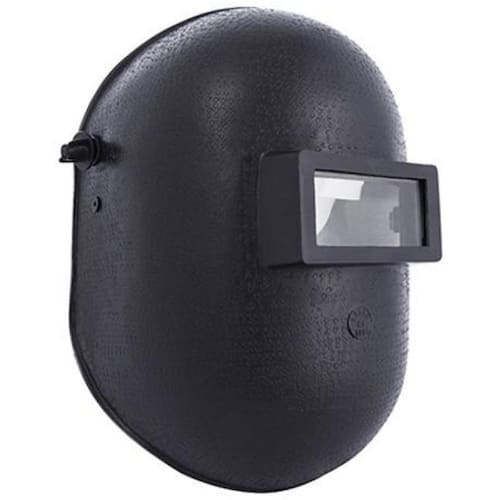 Máscara de segurança para trabalhos de soldagem composta de escudo confeccionado em polipropileno, com carneira de plástico, com superfície externa áspera e interna lisa, com carneira de plástico com regulagem de tamanho através de ajuste simples ou catraca, ou sem carneira e com cabo confeccionado de tubo plástico de aproximadamente 105 mm de comprimento e 25 mm de diâmetro.