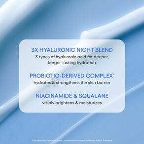 - Uma máscara de dormir coreana para hidratar profundamente e iluminar a pele enquanto você dorme. A fórmula de gel leve e refrescante envolve a pele em uma hidratação instantânea e refrescante, enquanto o 3x Hyaluronic Night Blend proporciona hidratação profunda e duradoura.