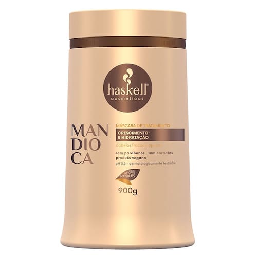 Máscara de Tratamento Haskell Mandioca Crescimento e hidratação. Indicada para cabelos secos, opacos e com dificuldade de crescimento, esta linha hidrata, nutre, auxilia no crescimento e no alinhament