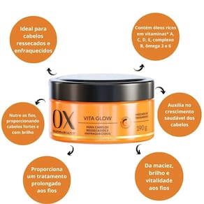 A Máscara de Tratamento Mari Maria Hair Vita Glow é ideal para cabelos ressecados e enfraquecidos. A combinação do blend de óleos ricos em vitaminas* A, C, D, E, complexo B, ômega 3 e 6 com o Sistema OX Beleza Duradoura, é a fórmula certa para nutrir os fios auxiliando no crescimento saudável dos cabelos. Sistema OX Beleza Duradoura: É uma tecnologia exclusiva, capaz de liberar sequencialmente os ingredientes, proporcionando um tratamento prolongado aos fios.Modo de UsoApós o uso do Shampoo, aplique a Máscara de Tratamento OX Mari Maria Vita Glow mecha a mecha deixe agir por 5 minutos e enxágue. Para melhores resultados, utilize toda a linha OX Mari Maria Vita Glow.ComposiçãoAQUA; CETEARYL ALCOHOL; DIMETHICONE; BIS-(ISOSTEAROYL/OLEOYL ISOPROPYL) DIMONIUM METHOSULFATE; STEARAMIDOPROPYL DIMETHYLAMINE; CYCLOPENTASILOXANE; CETRIMONIUM CHLORIDE; PARFUM; DIPROPYLENE GLYCOL; LACTIC ACID; DIMETHICONOL; BISAMINO PEG/PPG-41/3 AMINOETHYL PG-PROPYL DIMETHICONE; ETHYL LINOLEATE; ETHYL OLEATE; DISODIUM EDTA; BUTYLENE GLYCOL; BIS-LAURYL COCAMINOPROPYLAMINE/HDI/PEG-100 COPOLYMER; CRAMBE ABYSSINICA SEED OIL; PERSEA GRATISSIMA OIL*; HELIANTHUS ANNUUS SEED OIL*; GLYCERIN; AMYLOPECTIN; CI 15510; METHYLCHLOROISOTHIAZOLINONE/METHYLISOTHIAZOLINONE; CITRUS AURANTIUM DULCIS CALLUS CULTURE EXTRACT; COCOS NUCIFERA OIL*; LITHOTHAMNION CALCAREUM EXTRACT; LINUM USITATISSIMUM SEED OIL*; HYDROLYZED WHEAT PROTEIN; ZEA MAYS STARCH; ARGANIA SPINOSA KERNEL OIL*; MACADAMIA TERNIFOLIA SEED OIL*; OLEA EUROPAEA FRUIT OIL*; PANTHENOL; CI 17200; BIOTIN; CITRONELLOL; COUMARIN; GERANIOL; HEXYL CINNAMAL; d-LIMONENE; LINALOOL. *Vitaminas presentes dentro dos ingredientes: Abacate, Girassol, Coco, Linhaça, Argan, Macadâmia e Oliva.