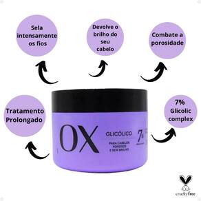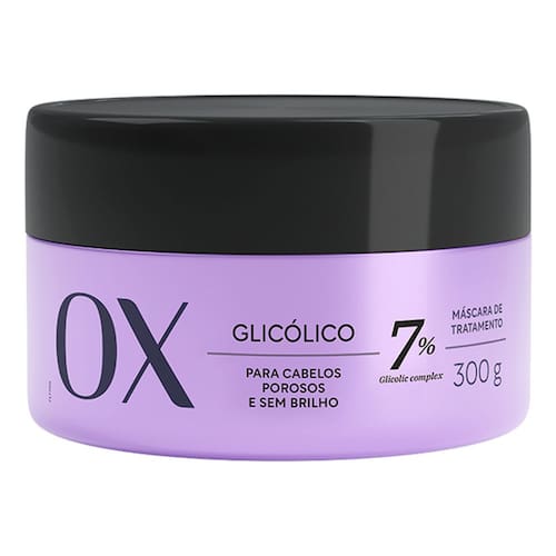 Máscara De Tratamento Glicólico 300g - OXIndicado para cabelos porosos e sem brilho.Isso porque o Glicolic complex combinado ao Sistema OX Beleza Duradoura, é a fórmula certa para selar intensamente os fios, combater a porosidade e proporcionar brilho imediatoSistema OX Beleza Duradoura é uma tecnologia exclusiva, capaz de liberar sequencialmente os ingredientes, proporcionando um tratamento prolongado aos fios.INDICAÇÃO DE USO:Após o uso do shampoo, aplique a Máscara de Tratamento OX Glicólico mecha a mecha, deixe agir por 5 minutos e enxágue. Para um tratamento completo, utilize o condicionador após a máscara. Para melhores resultados, utilize toda a linha OX Glicólico.BENEFICIOS:1. Brilho imediato por até 96h2. Hidrata por até 120h3. Sela intensamente os fios4. Reduz o aspecto poroso5. Preserva a estrutura da queratina dos fios6. Preenche a fibra capilar7. Restaura os danos8. Cabelos saudáveis9. Suavidade aos fios10. Reestabelece o nível de hidratação do cabelo.