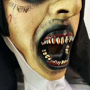A máscara retrata uma freira com olheiras profundas, boca aberta mostrando dentes manchados de sangue e veias pulsantes no rosto, tudo feito com precisão para parecer uma freira possuída de verdade.