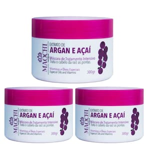 Com a Máscara Argan&Açai Maochi Cosmético, seus cabelos ficarão macios, brilhantes e super hidratados. Este kit contém 3 máscaras de hidratação de 300g cada. Com a Máscara Argan&Açai Maochi Cosmético, você terá cabelos saudáveis e bonitos em pouco tempo. Não perca essa oportunidade e adquira já o seu!