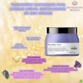 Máscara loréal professionnel blondifier coolMáscara de tratamento para cabelos loiros, descoloridos e com mechas.L'oréal professionnel série expert blondifier cool é ideal para neutralizar o tom, além de nutrir os fios.Ela proporciona nutrição profunda e neutralização dos tons amarelos e alaranjados indesejados e brilho intenso.Assim, garante um loiro com tom frio perfeito, maciez e luminosidade aos fios.A linhaA linha blondifier foi desenvolvida especialmente para um tratamento iluminador e neutralizante para loiros ou descoloridos. Os pigmentos roxos presentes da fórmula de loréal professionnel série expert blondifier cool retiram tons amarelados ou alaranjados que surgem com o tempo. Assim, garante um loiro perfeito, com muito mais maciez e um brilho fantástico.Ativos Açaí polyphenols:Importantes antioxidantes que previnem o desgaste oxidação dos cabelos claros ou descoloridos, sensíveis às exposições climáticas, poluição e outros fatores. Pigmentos violetas:Corantes violetas que neutralizam os tons amarelados indesejados dos cabelos loiros, revelando um tom frio e perfeito. Óleo de babaçu orbgnya oleifera :Contém vitamina e, com ação antioxidante e contribui para a nutrição dos fios.Indicado- cabelos loiros.- cabelos com coloração.- cabelos descoloridos.- cabelos desbotados.- cabelos danificados.- cabelos amarelados.- todos os tipos de cabelos.Benefícios- nutrição.- neutralização da cor.- reconstrução.- maciez.- luminosidade e brilho intenso.- proteção antioxidante.- antiamarelamento.Modo de uso Após lavar o cabelo com shampoo, se achar necessário, aplique o condicionador.E então, aplique a máscara pelo comprimento e pontas. Deixe agir de 3 a 5 min.Enxágue completamente. Dica para melhores resultados, use a linha completa blondifier cool de l'oréal.