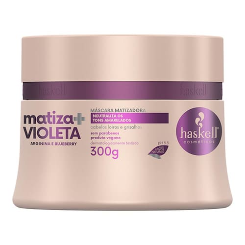 Máscara Matizadora Haskell Matiza+ Violeta 300g Indicação: cabelos loiros e grisalhos Neutraliza os pigmentos amarelados dos cabelos e promove nutrição à fibra capilar. Desenvolvida para neutralizar o