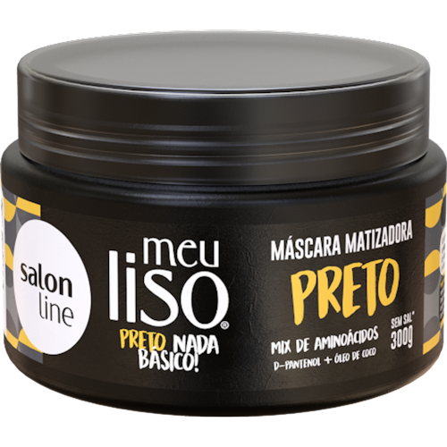 A Máscara Matizadora Meu Liso Preto possui fórmula enriquecida com mix de aminoácidos, d-pantenol e óleo de coco que, juntos, garantem matização intensa com efeito profissional e manutenção da cor.