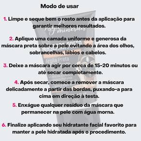 Modo de usar a Máscara Preta Facial Peel-Off: Limpe e seque bem o rosto antes da aplicação para garantir melhores resultados. Aplique uma camada uniforme e generosa da máscara preta sobre a pele evitando a área dos olhos, sobrancelhas, lábios e cabelos. Deixe a máscara agir por cerca de 15-20 minutos ou até secar completamente. Após secar, comece a remover a máscara delicadamente a partir das bordas, puxando-a para cima em direção à testa. Enxágue qualquer resíduo da máscara que permanecer na pele com água morna. Finalize aplicando seu hidratante facial favorito para manter a pele hidratada após o procedimento. Dica: Utilize a máscara uma ou duas vezes por semana, dependendo das necessidades da sua pele, para remover impurezas, oleosidade e células mortas, deixando-a com uma aparência mais suave e revitalizada