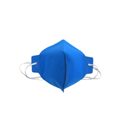 Respirador tipo peça semifacial filtrante, dobrável no tamanho único, sem válvula de exalação. Composta por uma manta em tecido não tecido na face interna (contato com o rosto do usuário) na cor branca e uma manta em tecido não tecido na face externa na cor azul.