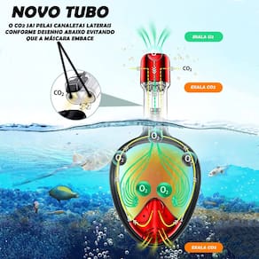Nossa Mascara Subaquática de de Mergulho Gold Sports Pro Polarizada Full Face Com Snorkel é muito mais longo do que a versão antiga, por isso é mais fácil de desmontar e respiração mais suave.Nosso suporte de câmera de máscara de snorkel é ajustável e móvel, você pode liberar para ajustar a altura. Enquanto o suporte da câmera da versão antiga é corrigido lá. A máscara de mergulho é feita de silicone líquido, é ambientalmente correta e anti-alérgica. Enquanto antes versão é feita de silicone normal. Nossa máscara quando você mergulha a válvula fecha automaticamente sem deixar entrar a água. Respirando naturalmente, a máscara de snorkel facial é muito mais fácil de usar do que a tradicional com o tubo bucal. Maior Área Visualizando. Máscara full face snorkel deixá-lo tirar mais proveito de suas aventuras subaquáticas. Headband ajustável do tecido elástico, fácil de usar e adequado para todos os tipos de forma da cabeça. Mais fácil do que nunca respirar confortavelmente pela boca ou nariz enquanto você está mergulhando Design de fluxo de ar duplo, respirando mais suavemente, qualquer pessoa que não queira respirar suavemente ao mergulhar. Sua lente e resvestida com uma camada polarizada comproteção UVA e UVB contra seus olhos, possui tambem um novo sistema de válvulas anti- fog