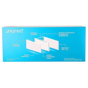 A máscara cirúrgica descartável uniqmed é indicada para proteção do usuário contra os patógenos de transmissão aérea por gotículas, projeção de fluidos corpóreos, partículas que flutuam no ar, oferecendo ainda proteção contra poeira, fumaça, poluição atmosférica, produtos químicos e alérgenos. - proteção de tripla camada com filtro - alta eficiência na filtragem de partículas e bactérias - 99% de eficiência na filtragem de bactérias - 99% de eficiência na filtragem de partículas - com pregas horizontais e clipe nasal ajustável - tnt de alta qualidade - elástico confortável e macio Características: - marca: uniqmed - medida: 17,5cm x 9,5cm - cor: branca - tipo iir: medical mask - origem: china - quantidade: 50 unidades por caixa , neste kit são 100un. - uso: descartável uso único descartável, destruir após o uso. Proibido reprocessar - validade: 3 anos após a fabricação - composição: tecido não tecido de uso odontólogas-médico-hospitalar 100% polipropileno, produzido através do processo sms spunbond + meltblown + spunbond . Clipe nasal: tira de alumínio maleável, revestida com plástico. - produto não estéril Certificações de qualidade: - registro: anvisa 80155470392 - iso: 13485 - exigência abnt nbr 15052:2004 Cuidados: - uso único; - não utilizar após o prazo de validade; - não recomendado para crianças menores de 3 anos; - manter longe de alcance de crianças; - descartar o produto imediatamente após o uso, conforme legislação vigente. - não reutilizar; - não usar em caso de sensibilidade ao tnt, alergias, dificuldade respiratória ou locais de baixa ventilação; - armazenar em temperatura ambiente e umidade relativa do ar máxima de 80%; - evitar exposição à alta temperatura e luz solar direta. Ean: 7898744830792