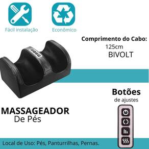 Descrição do anúncio: Presenteie-se com uma boa massagem todos os dias com o de pés/perdas/panturrilha. Especialmente projetado para relaxar os pés após um longo dia, este dispositivo possui um design anatômico que oferece conforto tanto nos pés quanto nas pernas. Equipado com internas para proporcionar relaxamento, possui cavidades laterais que garantem conforto durante o uso. Com dispositivo de proteção contra superaquecimento e desligamento automático após 15 minutos, é seguro e eficaz para uso diário. Conteúdo da embalagem: 01x de pés elétrico 01x fonte de alimentação Características: Design anatômico para uso nos pés, pernas e panturrilhas. internas para proporcionar relaxamento. Cavidade nas laterais para conforto durante o uso. Dispositivo de proteção contra superaquecimento com desligamento automático. Material: plástico, poliéster, componentes eletrônicos. Voltagem: 110v/220v Comprimento do cabo: 125cm Dimensões aproximadas: 30cm largura x 18cm profundidade x 14cm altura x 11cm abertura para pé Peso aproximado: 980g Especificações: Modelo: de pés elétrico Material: plástico, poliéster, componentes eletrônicos. Local de uso: pés, panturrilhas, pernas. Voltagem: 110v/220v Plugue de tomada: padrão eu Comprimento do cabo: 125cm Dimensões aproximadas: 30cm largura x 18cm profundidade x 14cm altura x 11cm abertura para pé Peso aproximado: 980g Principais perguntas sobre o produto e respostas: 1 qual a voltagem deste Este é bivolt, funcionando tanto em 110v quanto em 220v. 2 quais partes do corpo podem ser massageadas com este dispositivo Ele é projetado para massagear pés, panturrilhas e pernas. 3 é seguro deixar o ligado por um período prolongadoRecomenda-se o uso contínuo por até 15 minutos com intervalos entre as sessões para melhor eficácia e segurança. 4 este vem com Sim, oferecemos de 30 dias para este produto. Marca: Não Informado