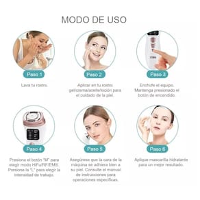 O massageador facial HIFU é uma ferramenta profissional incrível para o cuidado e rejuvenescimento do rosto. Combina 4 tecnologias altamente eficazes:HIFU (Ultrassom Focal de Alta Intensidade): ultrassom focalizado de alta intensidade. Consiste em aquecer as capas internas da pele através de ondas ultrassônicas de alta frequência que geram microquemaduras (indoloras e invisíveis) que forçam os fibroblastos a produzir mais colágeno e elastina, considerando o tempo uma pele mais tersa, suave e luminosa. Es tecnología de ultima generación que hasta hace un tiempo era solamente aplicable con costosos equipos en centros de estética.RF (radiofrequência): se injeta energia às cés para aumentar seu metabolismo e circulação sanguínea, o que estimula o aporte de nutrientes essenciais fomentando a produção de colágeno.LED: la luz LED esta comprovbadamente clinica que promove a produção de colágeno, diminui a acne, diminui a inflamação e a congestão da pele. Possui LED vermelho e LED azul. El primero es para aumentar el colágeno y el segundo para diminuir el acné.Iones Negativos: promueven la absorción efectiva de cremas y serums de belleza.Esta es la segunda generación, o podríamos llamarlo un upgrade de su versión anterior, porque incorpora microcorrientes que ayudan a suavizar las arrugas y las líneas de moderadas a profundas alrededor de la boca, ojos y frente.Si cada vez que realizabas un tratamiento para regenerar las cés del tejido de la piel, sentías que era necessario utilizar la radiofrequencia; ahora con este equipo lo puedes hacer. Além disso, ya no necesitarás recordar el modo y la potencia que estás usando, porque su nueva pantalla te mostra estes dados.Nesta nova versão, cuentas con 5 niveles de potencia y los disparos se realizan de forma continuúa (no tienes que pulsar cada disparo). Uma forma de trabalhar mais confortável e funcional! Obtenha um efeito lifting facial ou corporal com a tecnologia HIFU que atua na zona subcutânea sem danificar os tejidos.Se recomienda para: • Aumentar a produção de colágeno e a umectação da pele.• Dissolver la grasa y esculpir la cara gracias a su tecnología de luz LED y RF bipolar de 2 MHH Z.• Eliminar arrugas e linhas finas de expressão (de frente, nasolabiales, del labio, cuello, patas de gallo y corporal) .• Reducir papada, doble barbilla y poros.• Reducir la piel flácida y el acné.• Relajar la piel y acelerar la buena circulación.• Auxiliar a absorção béber melhor os nutrientes.