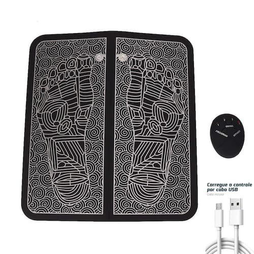 Massageador Tapete Pulso Elétrico Pés Ems USB Recarregavel Se você também sente dores nos pés, você faz parte de 36% da população de todo o mundo que também sentem o mesmo problema, mais não se preocupe, trouxemos para você o mais inovador e tecnológico massageador de pés do mundo. Ele age nas dores por ELETROESTIMULAÇÃO, ondas magnéticas de baixa e media intensidade, que em poucos minutos de uso já trazem um relaxamento nos músculos dos pés, deixando muito conforto e satisfação após o uso.
