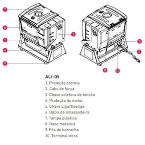 INFORMAÇÕES TÉCNICAS - Estrutura em aço com fino acabamento em pintura epóxi; - Capacidade de 3 Kg Farinha + ingredientes; - Acabamento de alta resistência em pintura epóxi; - Carenagem e tampa em polímero termo formado de alta resistência; - Cuba em aço inox; - Sistema basculante; - Pás fixas; - Capacidade de produção: até 7 Kg massa pronta. (depende a receita); - Tensão: Bivolt (110v/220v); - Potência: 110Volts 520 Watts / 220Volts 450 Watts; - Motor: 0,5 CV monofásico; - Frequência: 50-60Hz; - Fiação: cabo de alimentação Plug Monofásico; - Consumo (monofásico) 0,49 Kw/h; - Produto montado.