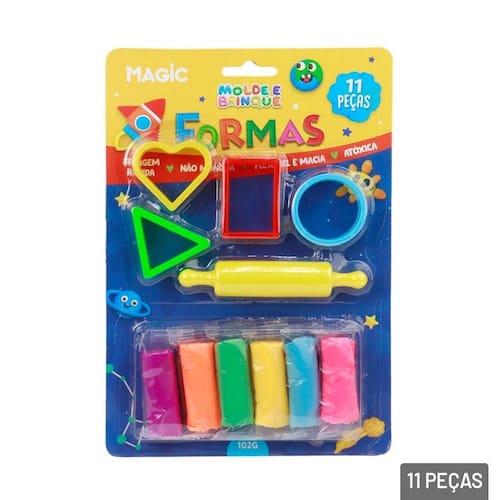 Massinha de Modelar 11 Peças com Moldes Form Colorido e super divertido, o conjunto inclui diversas massinhas e moldes com formas variadas, permitindo que os pequenos criem, aprendam e brinquem ao mesmo tempo.\nEspecificações:\nMarca : MAGIC KIDS\nTipo de material : Massinha, Plástico\nCores ou Estampa : Colorido\nDimensões do Produto : 25 X 17 X 1,5 CM\nDimensões da Embalagem : 25,5 X 17,5 X 1,5 CM\nPeso Bruto (Gramas) : 0.149