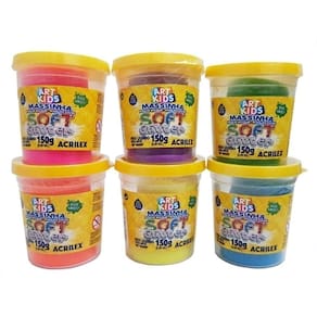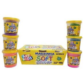 Nova Massinha de Modelar Soft Glitter Caixa com 6 Núcleos Variadas Acrilex 07366. Uma base de amido, super macia e com núcleos vivas e reforçados. Para uso escolar ou entretenimento. Ideal para atividades de desenvolvimento da progressão motora e percepção de formas. Não gruda nas mãos. Não tóxico.