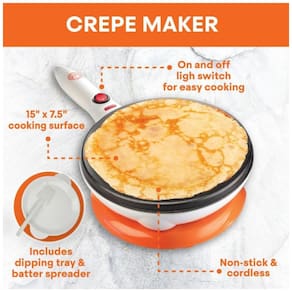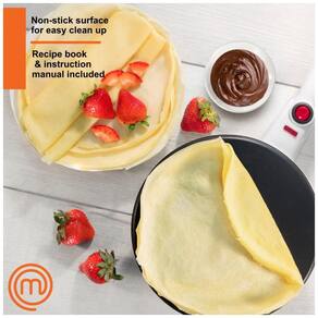 Máquina de crepe elétrica com superfície antiaderente. Inclui placa de imersão e espalhador de massa. Possui botão liga/desliga com luz indicadora de aquecimento. Base elétrica sem fio. Acompanha folheto de instruções e receitas.Chapa antiaderente