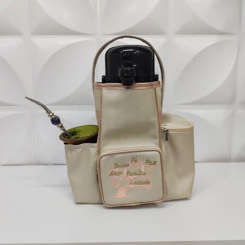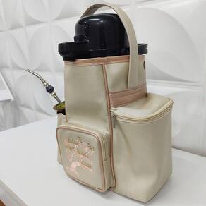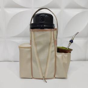 Possui 30 cm de altura x 29 cm de comprimento x 14 cm de largura. Possui 3 bolsos (um para o pacote de erva, um para a cuia e outro com zíper para levar objetos) e 1 compartimento principal para a térmica. Alça de mão. Possui forração interna. Metais Niquelados.