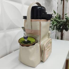 A nossa Bolsa Mateira possui compartimento para térmica com redução de tamanho nas costas (desse modo pode acomodar tanto a térmica grande quanto o modelo menor), possui um bolso para o pacote de erva mate, um bolso para a cuia e um bolso de zíper para levar objetos que desejar. Possui uma alça de mão para facilitar o transporte.