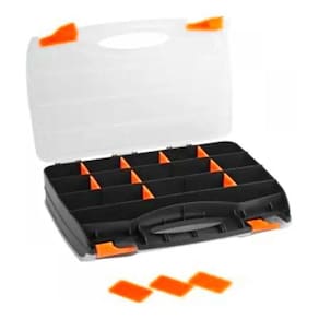 Matela Organizadora Plástico Parafusos até 5kg Transparente Indicado para acondicionar peças e acessórios, material de pesca, parafusos, pregos, porcas, remédios, entre outros. Possui 30 divisões removíveis e adaptáveis, alça para transporte e 4 travas.