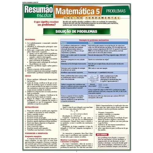 Este prático guia, da coleção Resumão escolar, explica como funciona o processo de resolução de problemas om dicas, estratégias e exemplos. Os pontos abordados são: traduzir os problemas (vocabulário, como usar dicas no contexto), como usar as estratégias (fazer tabelas, fazer o caminho inverso, resolver usando um problema mais simples, resolver usando razão, encontrar um padrão, trabalhar com hipóteses, etc.), tipos de problema e os erros mais comuns (resposta estimada ou precisa, conhecer as fórmulas, etc.).