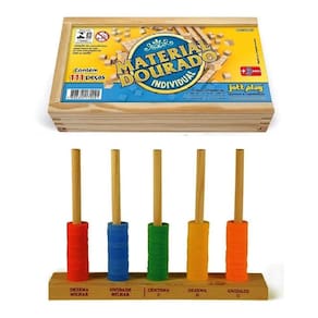 Conjunto de 2 jogos educativos pedagógicos em madeiraMaterial dourado 111 peças em madeira Uso: o material dourado foi idealizado pela médica e educadora italiana maria montessori com o objetivo de auxiliar o ensino e a aprendizagem do sistema de numeração décima-posicional, as operações fundamentais, frações-decimais, medidas, etc.Manuseando o material a criança tem a possibilidade de fazer uma imagem concreta das relações numéricas que são abstratas.Isto proporciona o desenvolvimento do raciocínio e o aprendizado muito mais agradável.Desenvolve: raciocínio, numeração decimal-posicional, operações fundamentais, frações decimais, medidas, inequações, etc. Idade: 1 até a 8 série / 07 anos.Composição: caixa de madeira medindo 13x13x6cm.Contém 1 placa centenas , 10 prismas dezenas e 100 cubos unidades .Ábaco aberto base em madeira e peças em e.V.A.Uso: permite a visualização do valor posicional, o que facilita a compreensão do sistema de numeração decimal.Utilizado como intermediário entre a construção da quantidade numérica e sua simbolização.Permite a realização das operações de adição e subtração e números naturais.Desenvolve: construção de quantidades numéricas, valor posicional, sistema de numeração, operações de adição e subtração.Idade: a partir da 1 série / 7 anos.Composição: aparelho de madeira medindo 21x15x6cm, com 5 hastes e 50 argolas em e.V.A multicoloridas. Marca: Mundo Feliz