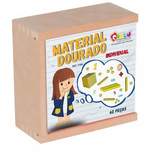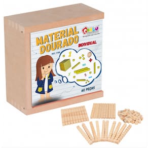 O Material Dourado foi desenvolvido com o objetivo de auxiliar o ensino e a aprendizagem da matemática.Descritivo detalhado: Confeccionado em madeira 62 peças, composto por 2 prismas representando as centenas medindo 10 x 10 x 1 cm, 10 prismas representando as dezenas medindo 10 x 1 x 1 cm e 50 cubinhos medindo 1 x 1 x 1 cm. Embalagem: Caixa de madeira medindo 12,5 x 12,5 x 6 cm, com tampa serigrafada. Lacrada com película de P.V.C. encolhível.