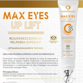 Max eyes up lift rejuvenescedor de pálpebra superior Oftalmologicamente testado O max eyes up lift atua especialmente no rejuvenescimento e revitalização da região da pálpebra superior incluindo a cauda da sobrancelha. Seu conjunto de ingredientes hidratam e fortalecem essa delicada região para um aspecto renovado. Modo de usar: sobre pálpebra superior e a cauda da sobrancelha, massageando levemente com a ponta da embalagem. Usar pela manhã e noite. Elevação da cauda da sobrancelha com efeito lifting na região dos olhos. Ideal para pálpebra superior e cauda da sobrancelha com efeito olhos de raposa Benefícios: Rejuvenesce a região dos olhos Minimiza rugas e linhas de expressão Harmonização e embelezamento do olhar Simplesmente perfeito Contém em sua composição: Vitamina c pura Argirelina Granactive Idealift Silício Aa2g Ácido hialurônico Bioestimulador de colágeno e elastina