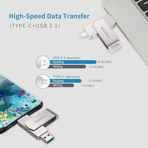 . 2 em 1 unidade flash USB tipo C sem cabo, tornou simples liberar espaço e transferir arquivos entre seus smartphones, tablets, laptops e PCs com capacidade de até 256GB (O armazenamento real é menor devido a diferentes sistemas de arquivos, arranjo de partição e outros fatores)Sem APPs ou instalação de software necessária, basta conectar seus dispositivos móveis e mover conteúdo com suporte ao OTG(em movimento). Faça backup eficaz de suas fotos, arquivos e velocidade de transferência de dados rápidas moreUltra - Desempenho impressionante unidade USB 3.1 Gen 1 com velocidade de transferência de até 150MB/s (A velocidade real pode variar de acordo com a condição de uso. Conectar-se à porta USB 3.0 melhora o desempenho.) Feito de liga de zinco, este pen drive USB-C apresenta maior resistência e resistência de cinco anos de garantia do fabricante com suporte técnico