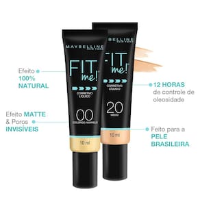 Corretivo Maybelline líquido para todos os tipos de pele. Camufla imperfeições e olheiras sem marcar as linhas finas. A textura fluida do Corretivo Fit Me! Maybelline permite cobertura natural e acabamento sem brilho.