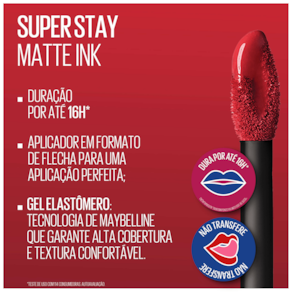 O Batom Líquido Longa Duração Maybelline Superstay Longa Duração Matte Ink proporciona acabamento matte impecável em uma variedade de cores super pigmentadas. Traz ainda um aplicador anatômico em formato de flecha, especialmente desenvolvido para se adequar ao formato dos seus lábios. Assim, você conquista uma boca marcante e irresistível em instantes. Com fórmula exclusiva e poderosa, o produto também assegura um filme de até 16 horas de duração nos lábios, com conforto, sem borrar ou transferir.