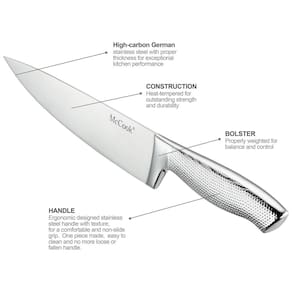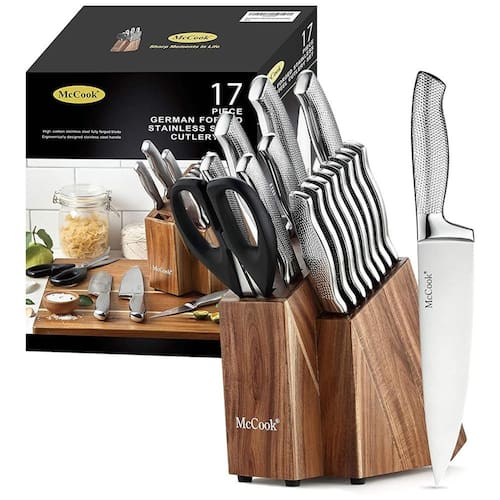 AÇO INOXIDÁVEL ALEMÃO FULL TANG Feito de uma peça de aço inoxidável, este conjunto de facas de cozinha martelado é de qualidade de conjunto de facas de restaurante e escola de culinária. Nossos conjuntos de facas passaram por pelo menos 5 verificações antes de serem enviados. CONJUNTO DE FACAS DE CLASSE MUNDIAL A exclusiva tecnologia de ponta cônica fornece afiação ideal para um corte preciso. A alça de design ergonômico proporciona conforto e confiança no manuseio. FÁCIL DE ZENAR Todas as facas forjadas são zenadas com segurança no bloco de facas de madeira de acácia para zenamento eficiente de espaço. Escolha McCook, confie na escolha de milhões de chefs. CUIDADO FÁCIL O conjunto de facas de cozinha com bloco é fácil e rápido de limpar. Para proteger a nitidez e o brilho das facas, NÃO lave as facas na máquina de lavar louça. Limpe e seque os imediatamente após a lavagem das mãos para tirar o máximo proveito deles Marca: Não Informado