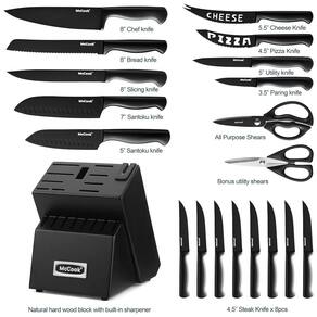 LAVADORA DE LOUÇA Uma peça feita, essas facas de aço inoxidável super pretas são laváveis. Você pode lavá los não apenas à mão, mas também à máquina. AFIADOR EMBUTIDO EXCLUSIVO Conjuntos de facas de aço inoxidável com afiador embutido são um bônus útil. Isso evita que você precise afiar lâminas em um aço de afiar. Antiaderente e resistente à ferrugem O revestimento preto evita que o aço oxide, de modo que o conjunto de facas de cozinha permanecerá antiaderente e resistente à ferrugem nos próximos anos. CONJUNTO DE FACAS PREMIUM Resistente a manchas e ferrugem, este conjunto de talheres de aço inoxidável de alto carbono é de qualidade de conjunto de facas para restaurantes e escolas de culinária. Todas as nossas facas passaram por pelo menos 5 verificações antes de serem enviadas Marca: Não Informado