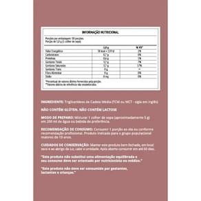 Especificações do produto: - formato: pó - quantidade por pote: 150 gramas 30 doses - a dose diária contém: 5g de tcm 70% de ácido caprílico e 30% de ácido cáprico - modo básico de consumo: 5g ao dia no horário em que se deseja ter energia Ean: 7898963981862