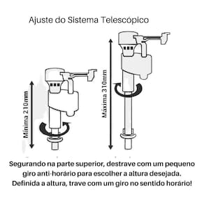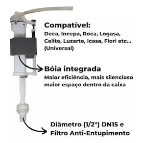 Mecanismo entrada torre reparo caixa acoplada universal siam Compativel para todas caixas acopladas Mecanismo de entrada universal acionamento superior. Descrição Mecanismo de entrada para caixas acopladas com acionamento vertical e ajuste do nível de água feito através do parafuso regulador. Permite instalação em diversos níveis, sendo compatível com caixas acopladas de diversas alturas. O nível de água se mantém mesmo com variação . Compatível com qualquer modelo e marca de caixa acoplada. Material: liga de cobre, plástico de engenharia e elastômero. Marca: Não Informado Ean: 7900100115747