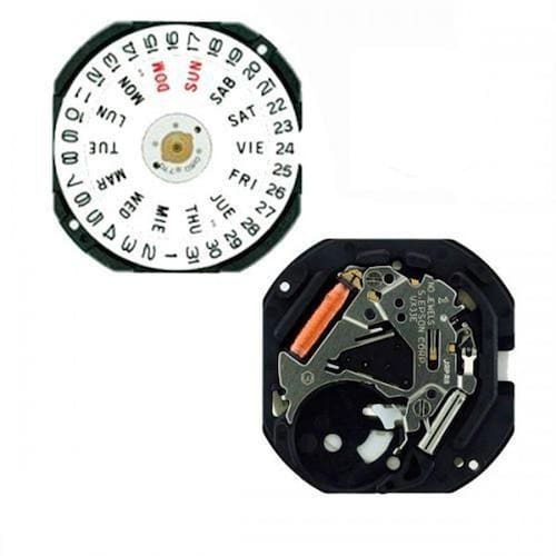 Mecanismo para Relógio VX33 Calendário Posição 3Diâmetro externo: 10 1/2 linha ou 23,3 mmMovimento 2,92 mm de espessuraAltura total da parte inferior do movimento até o topo do pinhão manual 4,5 mmTem uma exibição de dia e data às 3:00Mostrador é brancoRequer célula de observação 371Requer ponteiros de relógio: hora 1,10, minuto 0,65 e varredura de segundo 0,20 mmNÃO tem joiasFornecido com haste: 351177, torneira 10Inclui haste de relógioMovimento de quartzo H Marca: Hattori