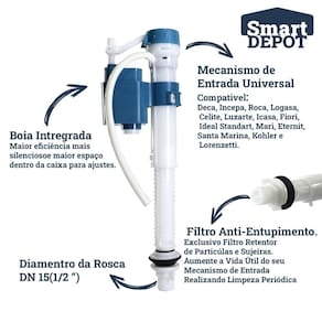 Marca: Smart Depot Material de fabricação: Plástico Modelo Universal: Compatível com todos os modelos de caixas acopladas Pressão baixa e alta : 0,02 a 0,4 Mpa, 2 a 40 mca Temperatura máxima da água: 40ºC Rosca de entrada: 1/2 DN15 Dimensões C x A x L : 10 x 25 x 5 cm Peso Apróx.: 220g Marca: Smart Depot