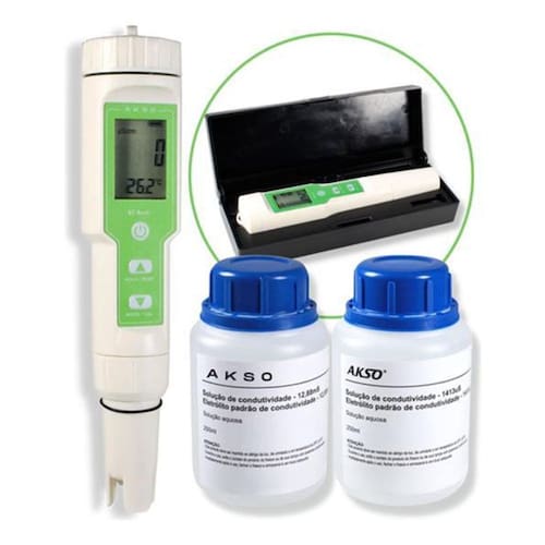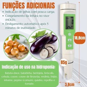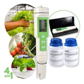 Medidor Condutivimetro Tds Salinidade Ppm + Soluções Padrão Compre com total tranquilidade pois priorizamos oferecer o melhor atendimento e apenas produtos de qualidade comprovada aos nossos clientes. ======================================================================= O EC Basic une em um instrumento de bolso 4 medições: condutividade, salinidade, TDS e temperatura. Possui eletrodo substituível, congelamento da leitura no visor e compensação automática de temperatura ATC . O EC Basic é excelente parceiro para os produtores de hidropônicos, devido a sua ampla faixa de medição. Outro ponto que vale a pena ser lembrado é que o instrumento pode ser ajustado em até 2 pontos: 12.88ms/cm e 1413uS/cm. Pode ser em diversos tipos de verduras, hortaliças e legumes dentro do ramo da hidroponia. Indicação de uso na hidroponia: batata-doce, batatinha, berinjela, brócolis, cebola, couve, couve de bruxelas, endívia, feijão, inhame, pepino comum , quiabo, repolho e tomate. O EC Basic utiliza a solução de condutividade 12.88ms/cm e 1413uS/cm para calibração. já inclusas . ======================================================================= INFORMAÇÕES TÉCNICAS Faixas de medição: Condutividade: 0 a 9999 S/cm 10.00 a 19.99 mS/cm 20.0 a 400.0 mS/cm Temperatura: 0 a 60.0C TDS: 0 a 9999 ppm 10.0 a 200.0 ppt Salinidade: 0 a 9999 ppm 10.0 a 200.0 ppt 0 a 25% Resolução: Condutividade: 1S/cm 0.1ms/cm 0.1ms/cm Temperatura: 0.1C TDS: 0.1 ppm 0.1 ppt Salinidade: 1ppm 0.1ppt 0.01% Exatidão: Condutividade: 2% F.S. Temperatura: 1.0C TDS: 2% F.S. Salinidade: 2% F.S. Ajuste de condutividade: 1413S/cm e 12.88ms/cm Compensação automática de temperatura ATC : 0 a 60C Grau de proteção: IP65 Desligamento automático: 5 minutos Temperatura de operação: 0 a 60C Umidade de operação: 10 a 90%UR sem condensação Alimentação: 4,5Vdc 3 pilhas LR44 Dimensões LxAxP : 38 x 183 x 38mm Peso: 80g ======================================================================= Funções adicionais: - Indicação de nível de carga das pilhas - Congelamento da leitura no visor HOLD ======================================================================= Clique no botão Comprar agora para garantir medidor Condutivimetro TDS Salinidade PPM + soluções padrão pelo melhor preço ======================================================================= Marca: Não Informado