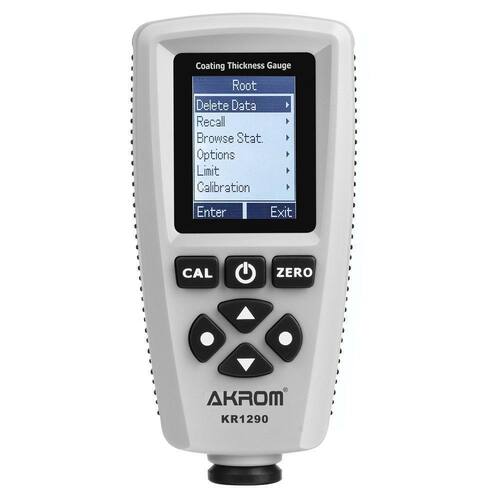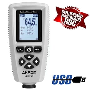 Medidor de espessura de camadas em bases fe/nfe com interface usb - kr1290+Certificado de calibração rastreável rbc/inmetroDescrição geralO kr1290 mede a espessura de camadas de revestimento ex.: tinta tanto em bases ferrosas fe por indução magnética quanto em bases metálicas não ferrosas nfe por correntes parasitas, identificando automaticamente o tipo de base 2 em 1 . Pode ser utilizado também para medir a espessura de plástico filme, papel e outros materiais com alto grau de exatidão. Possui faixa de medição de 0 a 1300 um e memória para até 400 medições, sendo 80 temporárias grupo dir e 320 permanentes grupos gen 1-4 , além de apresentar dados estatísticos, como nº de medições, máxima, mínima, média e desvio padrão.Pode ser facilmente calibrado ajustado pelo usuário em até 5 pontos por grupo e por tipo de base 50 pontos no total , é fornecido com 5 lâminas de poliéster padrões de referência com espessuras 50, 100, 250, 500 e 1000 um , bloco de ferro base f e bloco de alumínio base n , além de permitir a configuração de alarmes caso a espessura medida esteja fora dos limites aceitáveis valores máximo e mínimo definidos pelo usuário .Permite conexão direta com o computador através da porta usb para descarregar os resultados das medições realizadas cabo usb e cd com software inclusos .Exemplos de uso em bases ferrosas f :Camadas não magnéticas tinta, plástico, borracha, papel, porcelana, esmalte, cobre, zinco, alumínio, cromo, resina aplicadas sobre bases metálicas de materiais ferrosos ferro, níquel, aço . Exemplos de uso em bases não ferrosas n :Camadas não magnéticas e não condutivas verniz, tinta, esmalte, plástico, borracha, vidro, resina aplicadas sobre bases metálicas condutivas e não ferrosas alumínio, cobre, latão, aço inoxidável não magnético . Especificações técnicasFaixa de medição: 0 a 1300 um / 0 a 51,18 mils / 0 a 1,30 mmResolução: 0,1 um 0 a 99,9 um 1 um 100 a 999 um 10 um = 0,01 mm 1000 a 1300 um Exatidão: ± 3% + 2 µm Raio de curvatura mínimo: 2 mm externo / 25 mm interno Diâmetro mínimo da superfície: 6 mmEspessura mínima da base: 0,5 mm fe / 0,3 mm nfe Temperatura de operação: 0 a 40°cUmidade de operação: 10 a 90%ur sem condensação Alimentação: 3v 2 pilhas aaa Dimensões l x a x p : 53 x 110 x 24 mmPeso: 110 gRecursos principais- identificação automática do tipo de base f ou n - seleção da unidade de medição um, mils, mm - memória para armazenar até 400 medições grupos dir e gen 1-4 - porta usb para conexão com o computador- modo de medição simples ou contínuo- indicação do nível de carga da bateria- alarmes de máxima e mínima configuráveis- display gráfico com iluminação backlight - sistema de navegação por menus para configuração dos parâmetros- calibração ajuste em até 5 pontos zero + 4 pontos para cada base e cada grupo- dados estatísticos: n° de medições, máxima, mínima, média e desvio padrão- desligamento automático após 3 min. De inatividade configurável Itens inclusos- bloco de ferro base f - bloco de alumínio base n - 5 lâminas de poliéster padrões de referência - cd com software- cabo usb- 2 pilhas aaa alcalinas- maleta rígida para transporte- manual de instruções em português