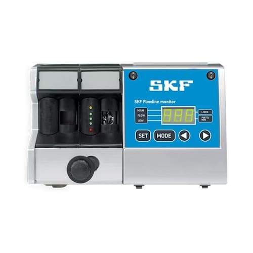 O SKF Flowline Monitor é utilizado para dividir, medir e controlar a vazão em sistemas de lubrificação por óleo circulante. Os três tamanhos diferentes de medidor de vazão permitem controle e monitoramento de vazões de 0,1 a 100 l/min com viscosidades operacionais de 32 a 1.000 mm.2/s. Os medidores de vazão operam de maneira individual e podem ser programados e ajustados separadamente. Independentemente de mudanças na temperatura e na viscosidade do óleo, o SKF Flowline Monitor fornece resultados precisos. A configuração por computador e o monitoramento remoto são possíveis. Módulos de monitoramento estão disponíveis para oferecer alarmes comuns, alarmes individuais para cada ponto de lubrificação, bem como interfaces para processar controles.