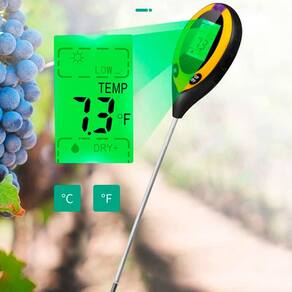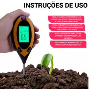 O instrumento de pesquisa de solo 4 em 1 pode testar a umidade do solo, valor de pH, temperatu- ra e intensidade da luz solar do ambiente. utilizando uma sonda com comprimento de 200mm. A unidade pode exibir facilmente várias leituras em um grande display LCD. O dispositivo também possui indicação de bateria fraca e função de desligamento automático. Ele economiza tempo e energia. sendo altamente eficiente. A unidade garante a qualidade do plantio de flores e gramas. além de ajudar na manutenção de jardins e áreas verdes