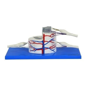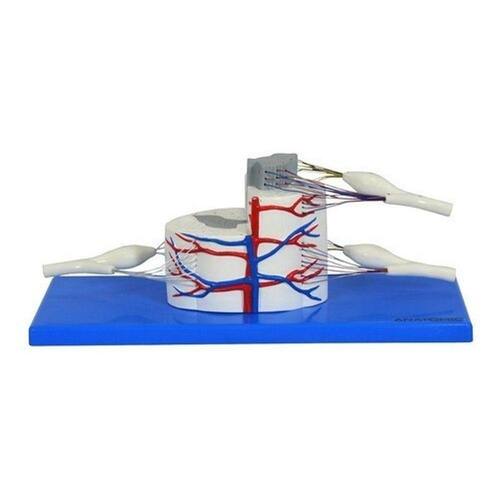 Modelo anatômico da medula espinhal, ampliado aproximadamente 6 vezes o tamanho natural, evidencia estruturas internas e externas. Nervos e vasos sanguíneos, numerados em 21 pontos específicos e confeccionado em resina plástica, montado sobre placa.