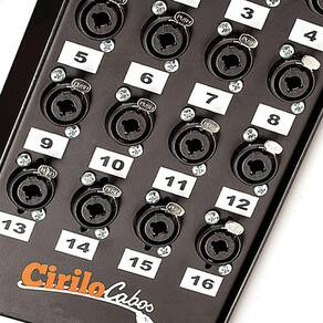 A banheira da Cirilo Cabos feita em metal com pintura epóxi preto, tem uma alça para facilitar o transporte. O cabo espaguetado e numerado via-a-via orienta na usabilidade do produto. Na extremidade do multicabo, tem uma mola de proteção. Esta caixa de conectores é resistente e durável, suporta o ritmo de trabalho de quem produz engenharia sonora.