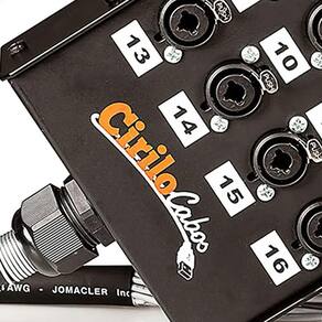 A banheira da Cirilo Cabos feita em metal com pintura epóxi preto, tem uma alça para facilitar o transporte. O cabo espaguetado e numerado via-a-via orienta na usabilidade do produto. Na extremidade do multicabo, tem uma mola de proteção. Esta caixa de conectores é resistente e durável, suporta o ritmo de trabalho de quem produz engenharia sonora.