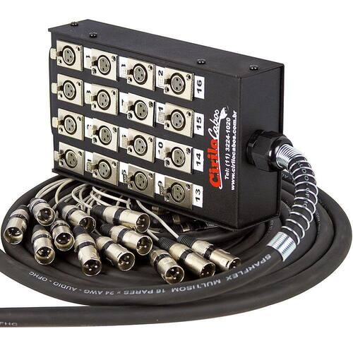 Medusa 16 Vias Montada Conectores Cirilo Cabos - 25 Metros A Medusa de 16 vias montada com conectores da Cirilo Cabos, também conhecida como caixa de conectores ou banheira, oferece organização na distribuição dos seus canais. Ideal para a transmissão de áudio, oferecendo uma melhor qualidade entre os instrumentos e a mesa de som. Conta com alça para transporte e multicabos com molas de proteção.