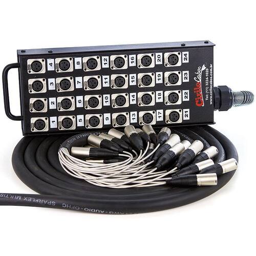 Medusa 24 Vias Com Conectores Xlr Neutrik - 5 Mt Medusa montada pela Cirilo Cabos com conectores XLR da marca Neutrik, que fabrica conectores que são usados em estúdios de gravação de áudio e vídeo e sistemas de som. Este produto é ideal para transmissão de som profissional, sem prejuízos na qualidade ou interferência de ruídos externos. A banheira da Cirilo Cabos feita em metal com pintura epóxi preto, tem uma alça para facilitar o transporte. O cabo espaguetado e numerado via-a-via orienta na usabilidade do produto. Na extremidade do multicabo, tem uma mola de proteção. Esta caixa de conectores é resistente e durável, suporta o ritmo de trabalho de quem produz engenharia sonora. Este produto vai te auxiliar na organização de palco e distribuição dos canais para instrumentos e músicos. A medusa de som com seis vias é um ponto de ancoragem de palco que vai reduzir o fluxo de cabos levados até a técnica. Com ela você otimiza seu projeto de som, conectando instrumentos com saída P10, cabos de microfone e outros. ESPECIFICAÇÕES Canais: 24 Vias Conector painel: XLR F Neutrik Conector cabo: XLR M Neutrik Diâmetro do cabo: 11,60mm Marcas de cabos disponíveis: TiaFlex, SparFlex ou Datalink Condutor: Corda de cobre estanhado OFHC 24 AWG; dreno de cobre estanhado OFHC + fita de poliéster Isolação: Termoplástico resistente a altas temperaturas e baixa retração durante a solda Garantia de 3 meses. Precisa de uma configuração especifica Aqui na Cirilo Cabos nós temos diversas configurações, de 6 vias até 48 vias, podendo ser montadas de acordo com a sua necessidade. Dentro dessa variação de 6 a 48 vias o valor será o mesmo apresentado no site. Qualquer outra configuração acima disso, por favor, consulte nossos vendedores de Segunda á Sexta das 09:00 às 18:00.