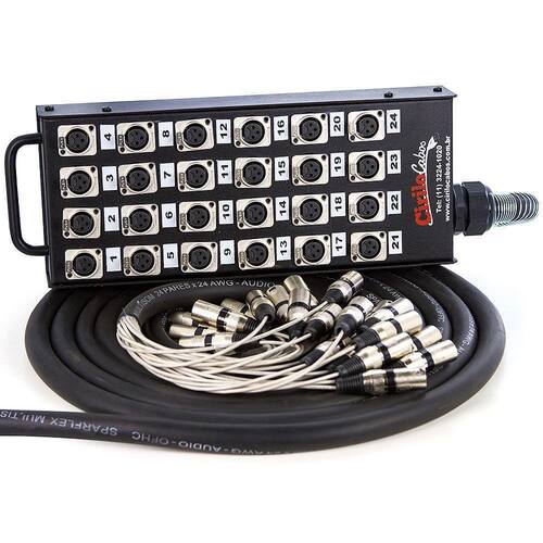 Medusa 24 Vias Montada Com Conectores Cirilo Cabos 20 Metros A medusa de 24 vias montada com conectores da Cirilo Cabos, também conhecida como caixa de conectores ou banheira, oferece organização na distribuição dos seus canais. Ideal para a transmissão de áudio, oferecendo uma melhor qualidade entre os instrumentos e a mesa de som. Conta com alça para transporte e multicabos com molas de proteção. Para que serve a medusaAs medusas montadas pela Cirilo Cabos, são bastante utilizadas para projetos de som, podendo ser ligados cabos de microfones XLR, instrumentos musicais com saídas P10 entre outros. Ao invés de você ter aquele monte de cabos passando pelo palco, você liga a medusa na mesa de som e estica um único cabo para ligar diversos equipamentos, tornando o sistema de som muito mais organizado. Tudo representado muito pouco no custo total. Onde a medusa é utilizada Palcos, Shows, Igrejas, Eventos entre outros. Marca do Multicabo:TiaFlex, SparFlex ou Datalink Conexão: XLR Macho e XLR Fêmea Vias:multicabo 24 vias Isolação: - Termoplástico resistente a altas temperaturas e baixa retração durante a solda. - Condutor dreno de cobre estanhado OFHC + fita de poliéster. - Cobertura em PVC emborrachado de alta flexibilidade e resistência mecânica gravado metro a metro. Garantia: 3 meses Precisa de uma configuração especifica Aqui na Cirilo Cabos nós temos diversas configurações, de 6 vias até 48 vias, podendo ser montadas de acordo com a sua necessidade. Dentro dessa variação de 6 a 48 vias o valor será o mesmo apresentado no site. Qualquer outra configuração acima disso, por favor, consulte nossos vendedores de Segunda á Sexta das 09:00 às 18:00.