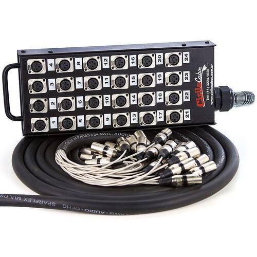 Medusa 24 Vias Montada Conectores Cirilo Cabos - 10 Metros A Medusa de 24 vias montada com conectores da Cirilo Cabos, também conhecida como caixa de conectores ou banheira, oferece organização na distribuição dos seus canais. Ideal para a transmissão de áudio, oferecendo uma melhor qualidade entre os instrumentos e a mesa de som. Conta com alça para transporte e multicabos com molas de proteção.
